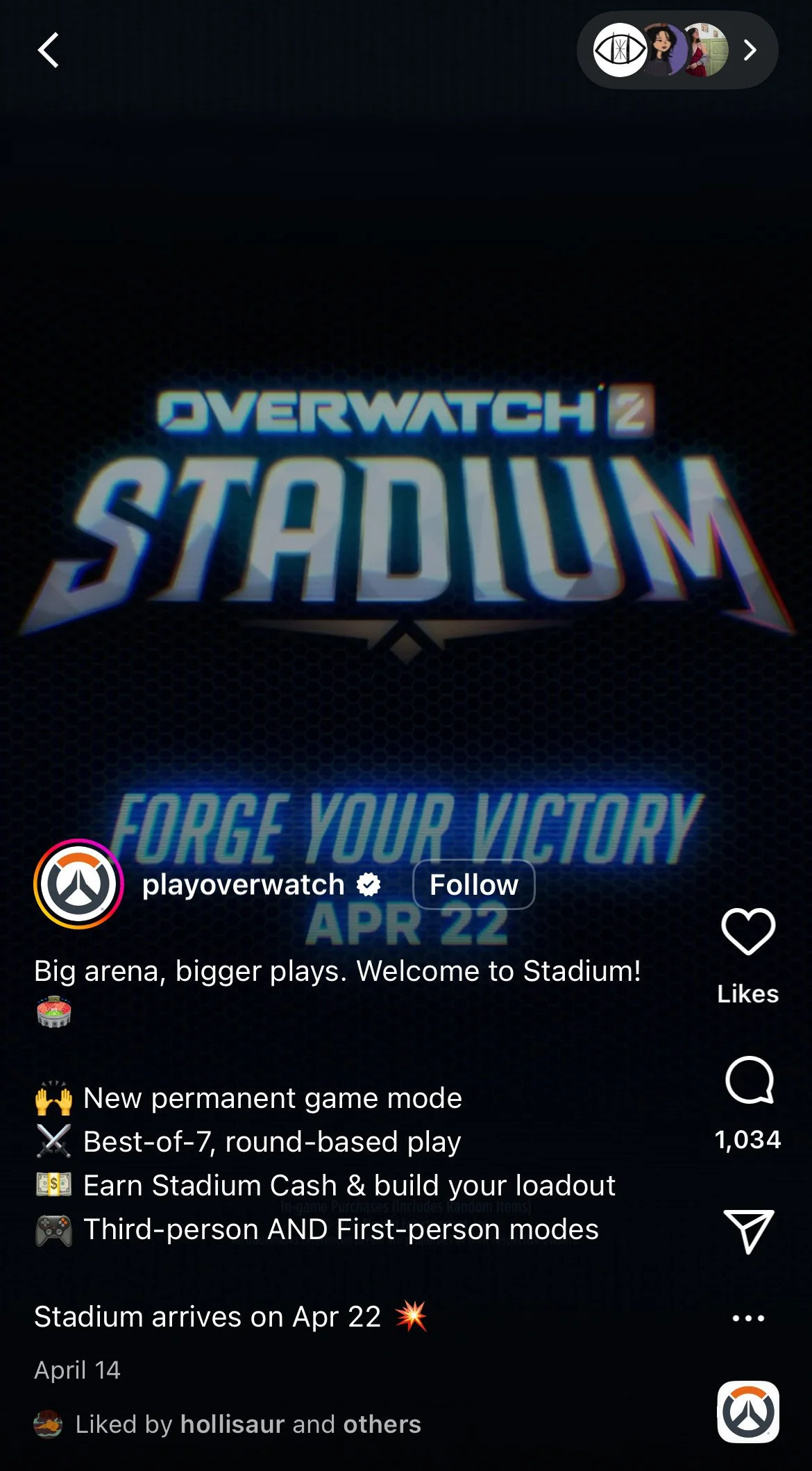 Notification from a mobile device about Overwatch 2 Season 15 being live, mentioning Hero Upgrades, new competitive year, and new rewards.